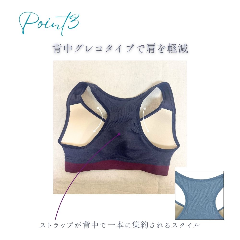 背中はグレコタイプで肩まわりが動かしやすく、トレーニングやヨガ、日常使いにもピッタリです