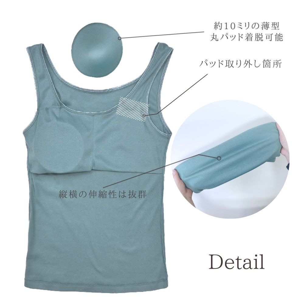 綿混素材の伸びが有る生地を使用しており、パッドは取り外し可能な丸型パッド