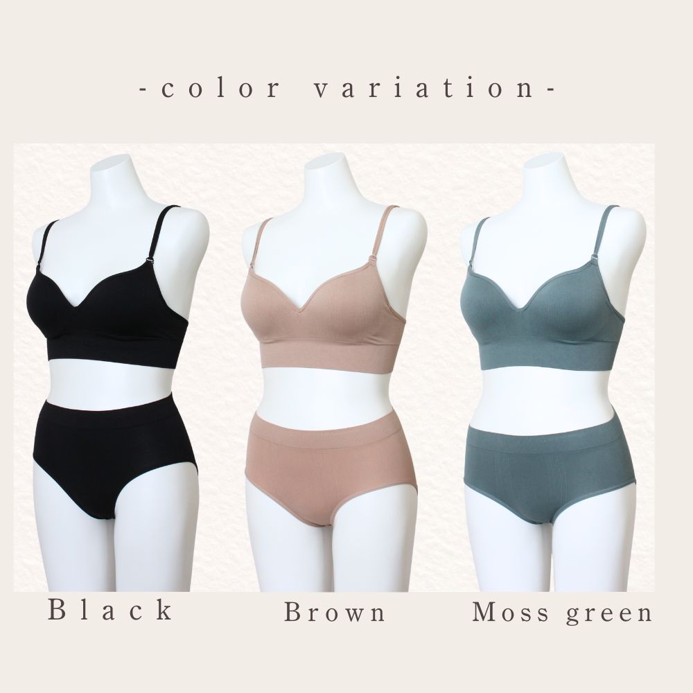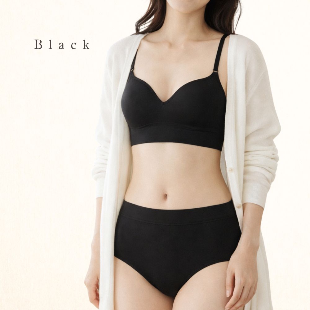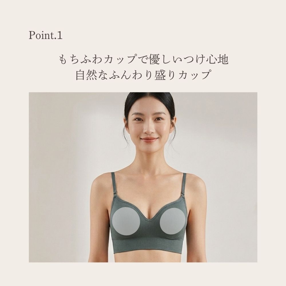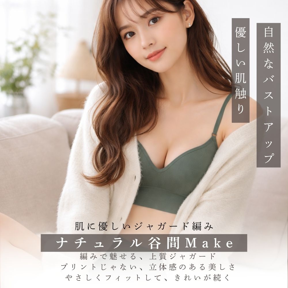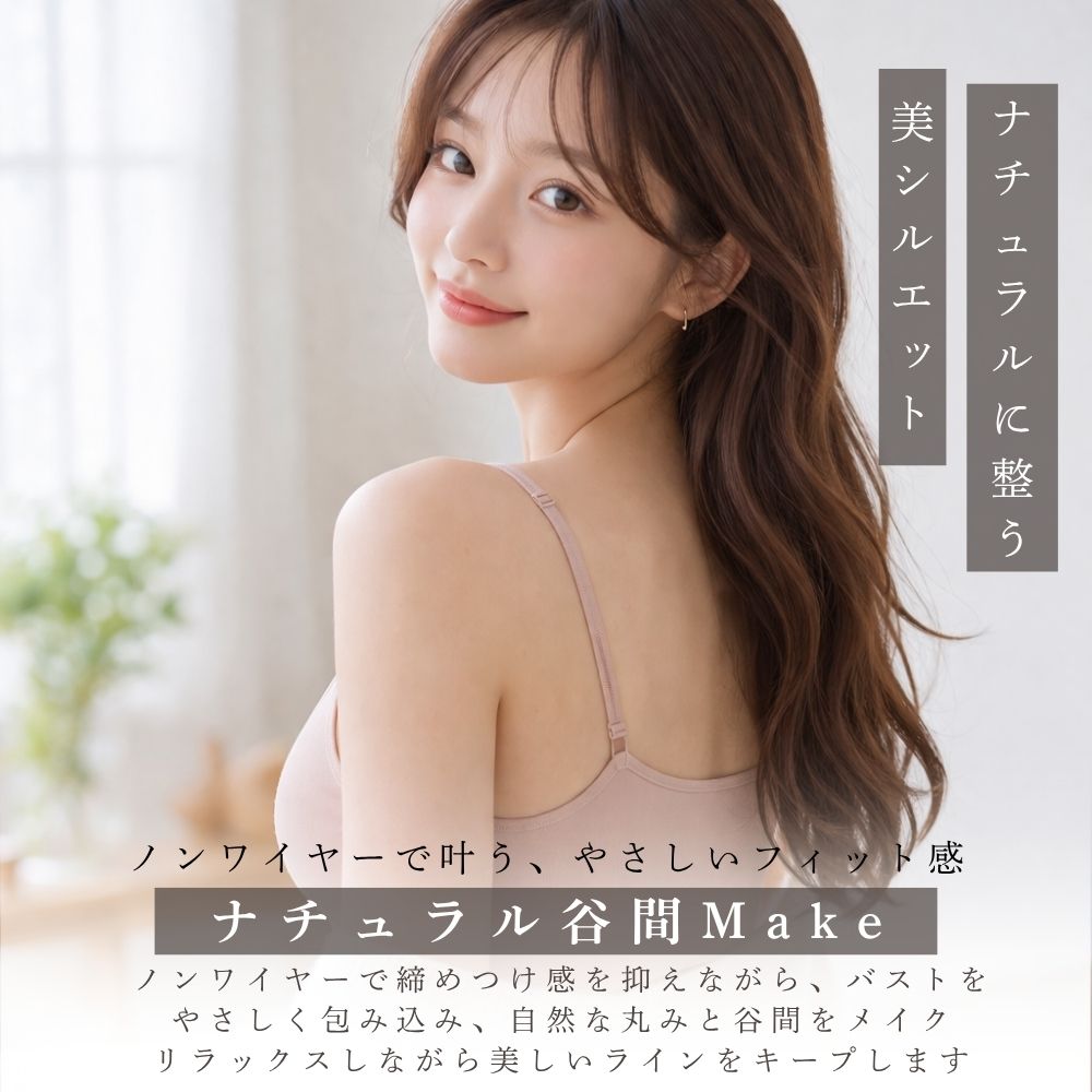 この「ナチュラル谷間メイクブラ」は、快適さと美しさを兼ね備えたノンワイヤーブラです。もちふわカップが自然なバストアップを実現し、ジャガード編みのカップ面が少しお洒落な印象を与えます。ストレッチ素材で軽やかにフィットし、ストラップは調整可能でズレにくい設計です。プリントタグが肌への刺激を軽減し、優しい肌触りを提供します。リラックスしたい日やスポーツ、産後の使用にも最適です。